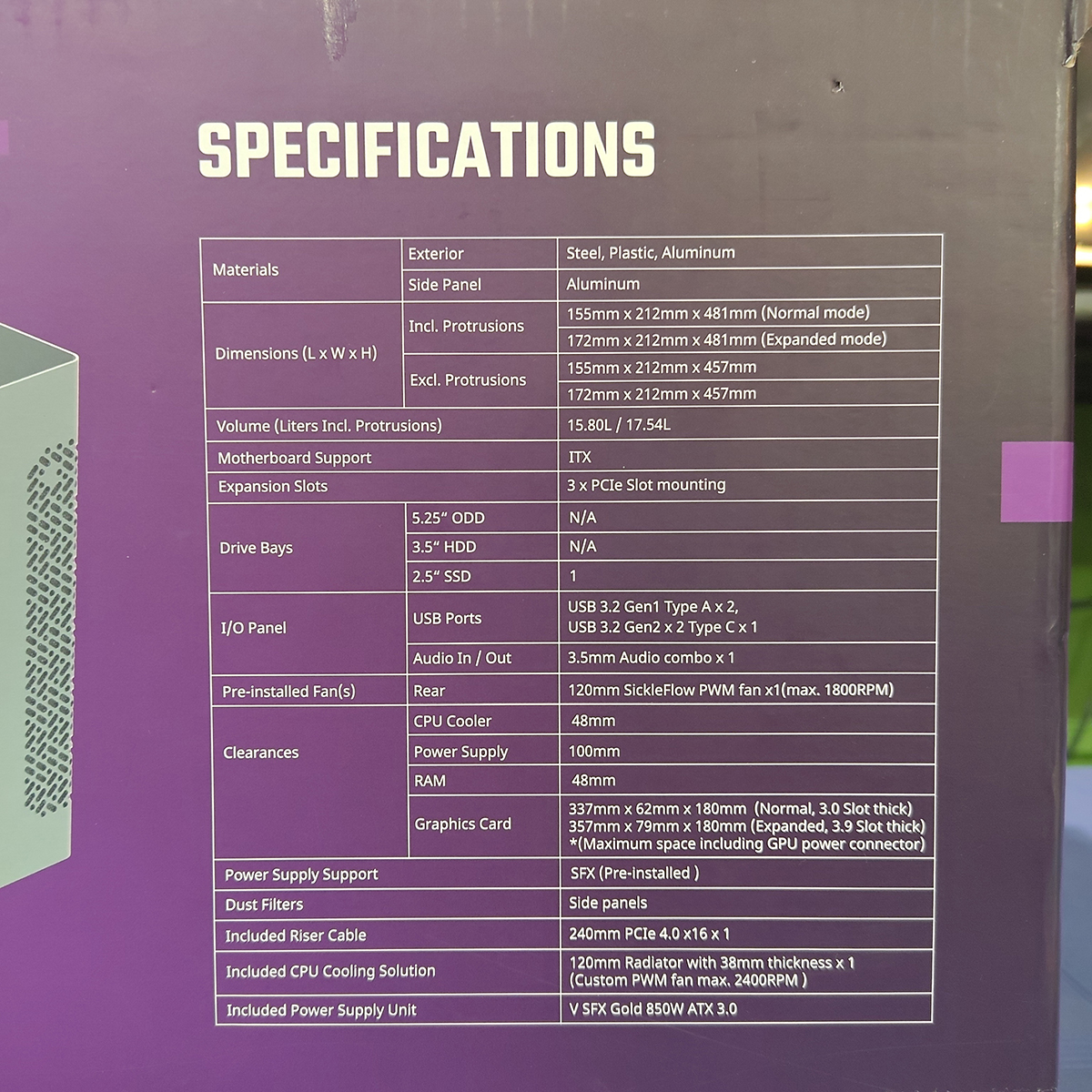 預裝空間 - 顯示卡:337mm x 62mm x 180mm (一般模式, 3槽PCIe厚度), 357mm x 79mm x 180mm (拓寬模式, 3.9槽PCIe厚度)), (以上空間已包含GPU電源連接器)